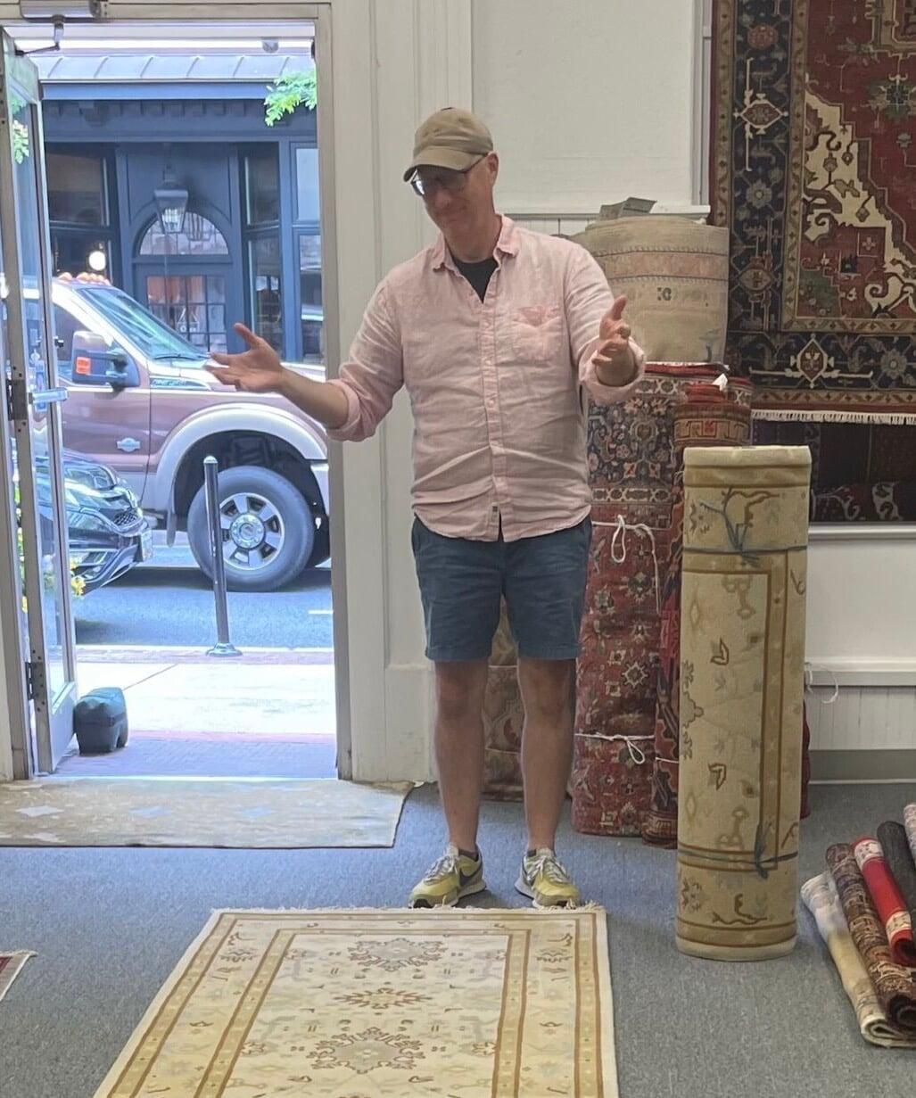 Here is my friend Kirk Ross from Talbot Oriental Rug in Maryland. Kirk used to work at Chestertown, Maryland. We met in 1999 at our showroom in Manhattan. Kirk disappeared for few months only to get a call saying he opened his own store about 50 miles south. So we started Our friendship. After 25 years, Kirk is looking at 7 runners we delivered for his client and all of them came out perfect. It is always good to see him smile. We have probably done over 40-50 custom rugs over the last 2 decades.