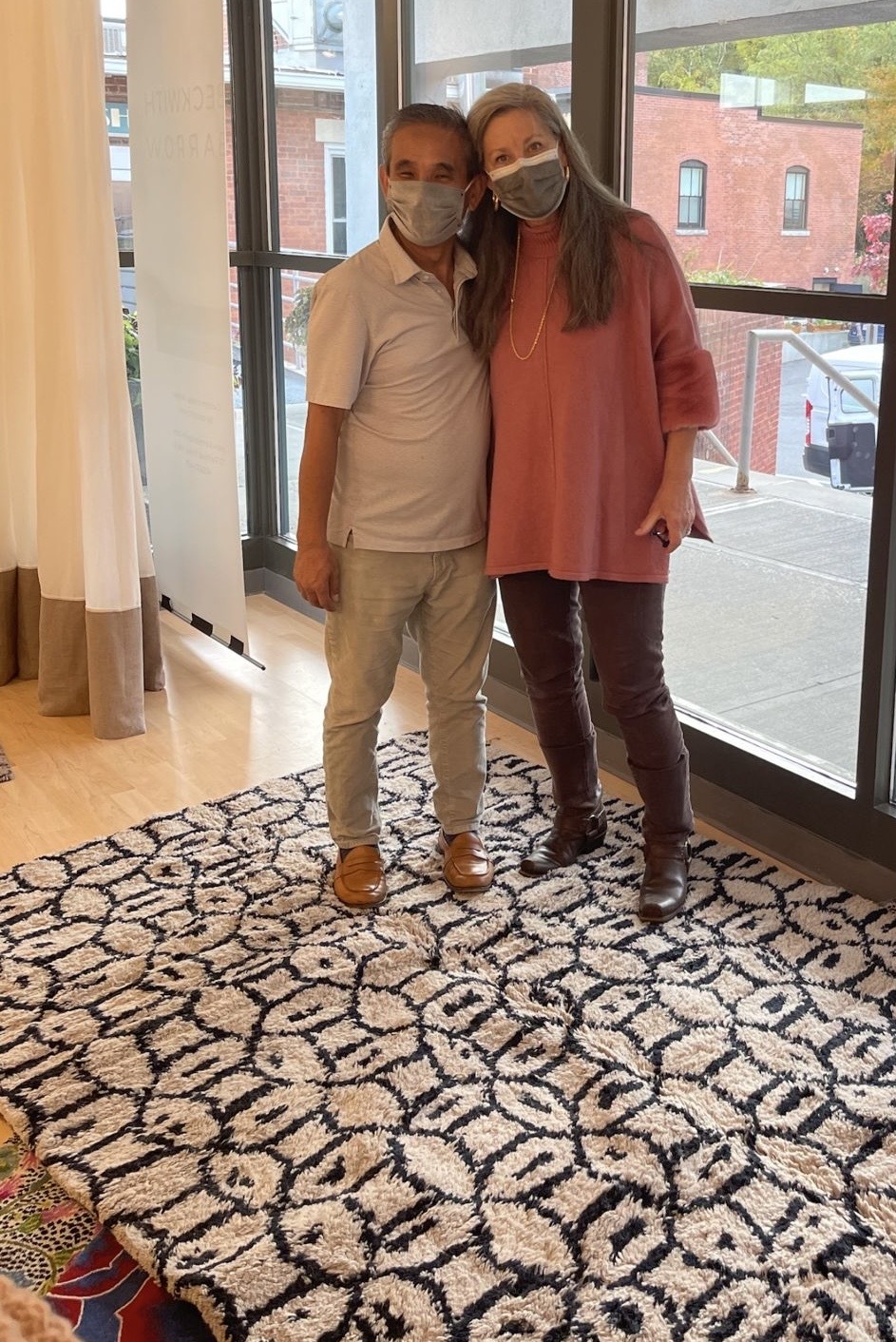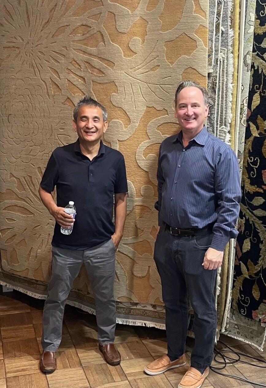 Cris from Tiftickjian Rug in Buffalo, Upstate New York. Cris is my fellow New Yorker we usually meet during the Atlanta Rug Show. In the background is the Design Posey Terracotta in 8ft x 10ft of 100 knots wool & silk quality. One time I drove 15 hrs from NYC to Buffalo and back the same day. We talked about the good old days when there were only a few Tibetan rug dealers like Tufenkian, Tamarian, us and maybe 1-2 more. How time flies? I still get emails from Cris about new patterns and qualities.